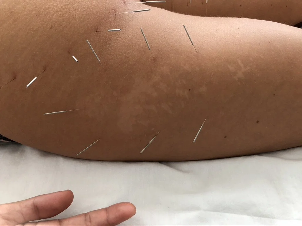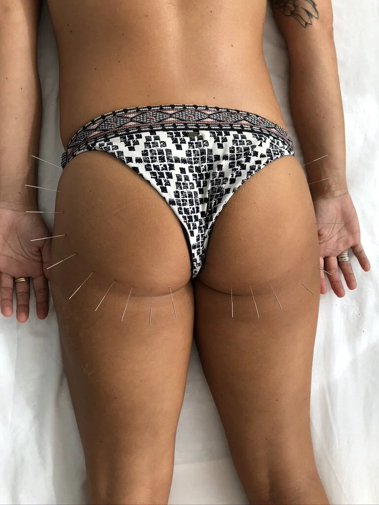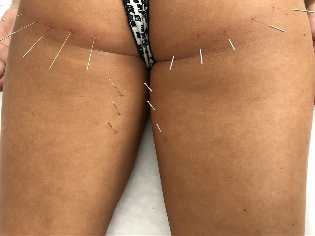 Upper thighs lateral – posterior targeting excess tissue and cellulite using leaf technique. Excess tissue and cellulite are deposited generally in the upper thigh area around the greater trochanter. The leaf technique consists of surrounding the focused area of treatment with six needles proportionally, with a seventh needle inserted through the middle of the surrounding needles in the direction of the meridian in the shape of a leaf.